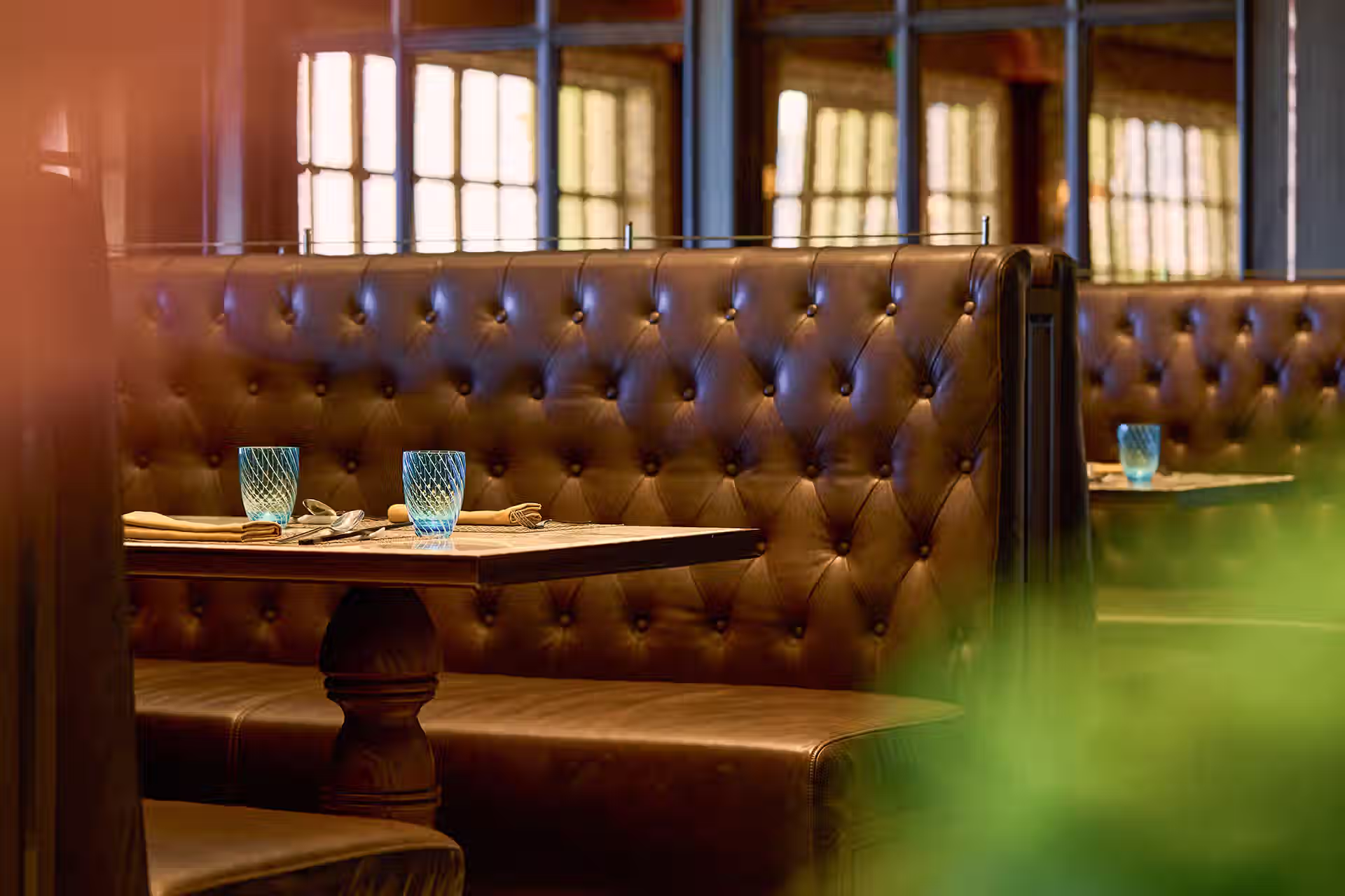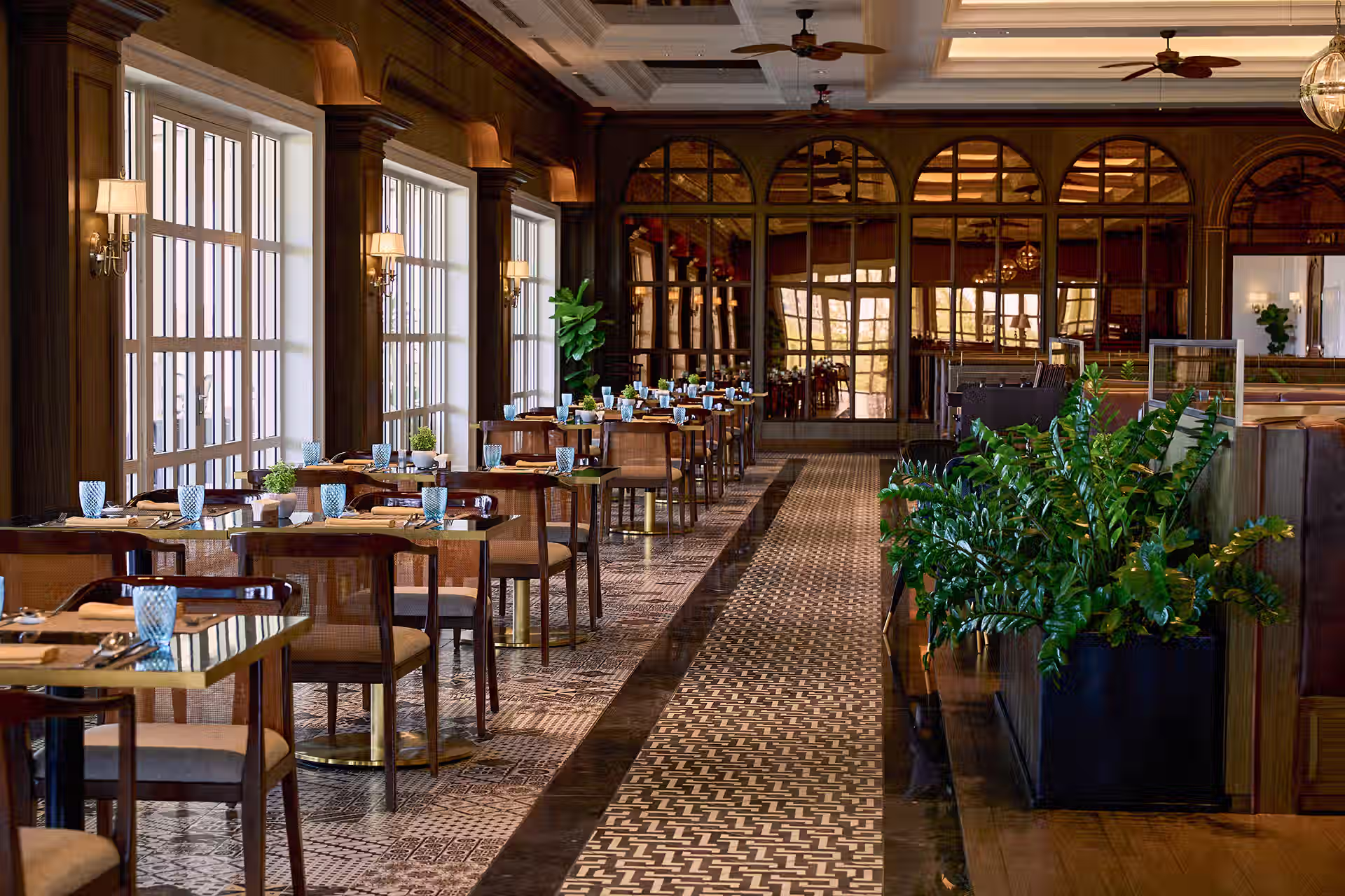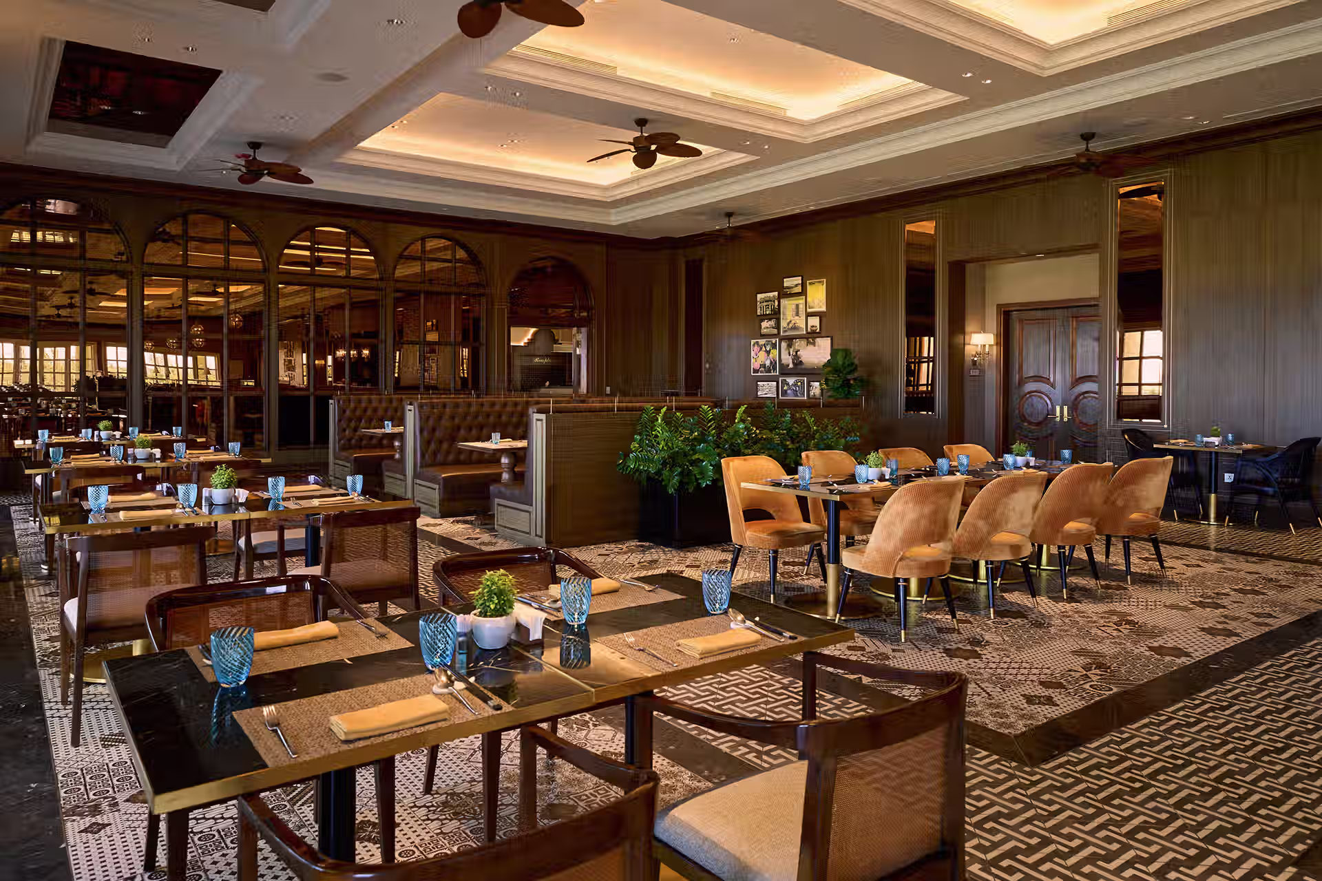 Classic wood and leather elegance overlooking award-winning golf course where Western favorites meet Vietnamese classics and Chinese offerings perfectly.