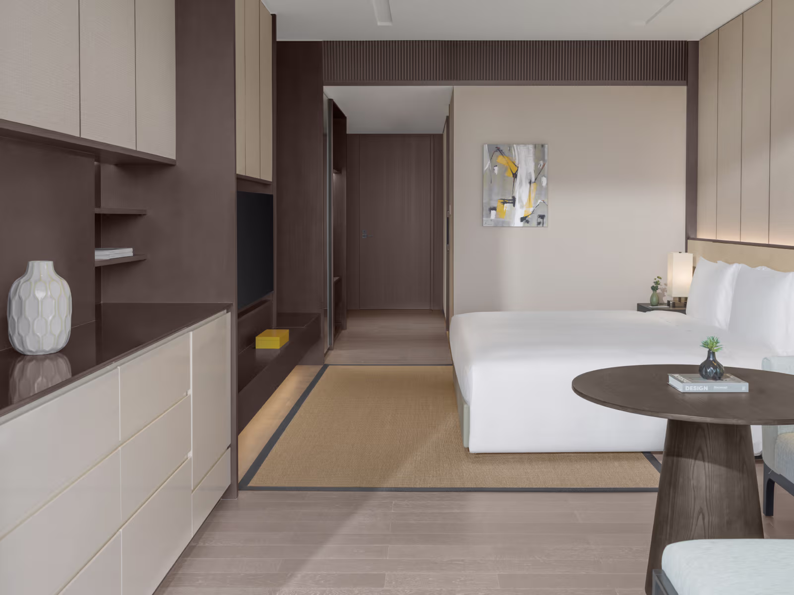 Choice of stunning water views for daily inspiration, spacious king bed relaxation, premium entertainment options, bathroom wellness moments, and perfect sunrise-to-moonlight views.