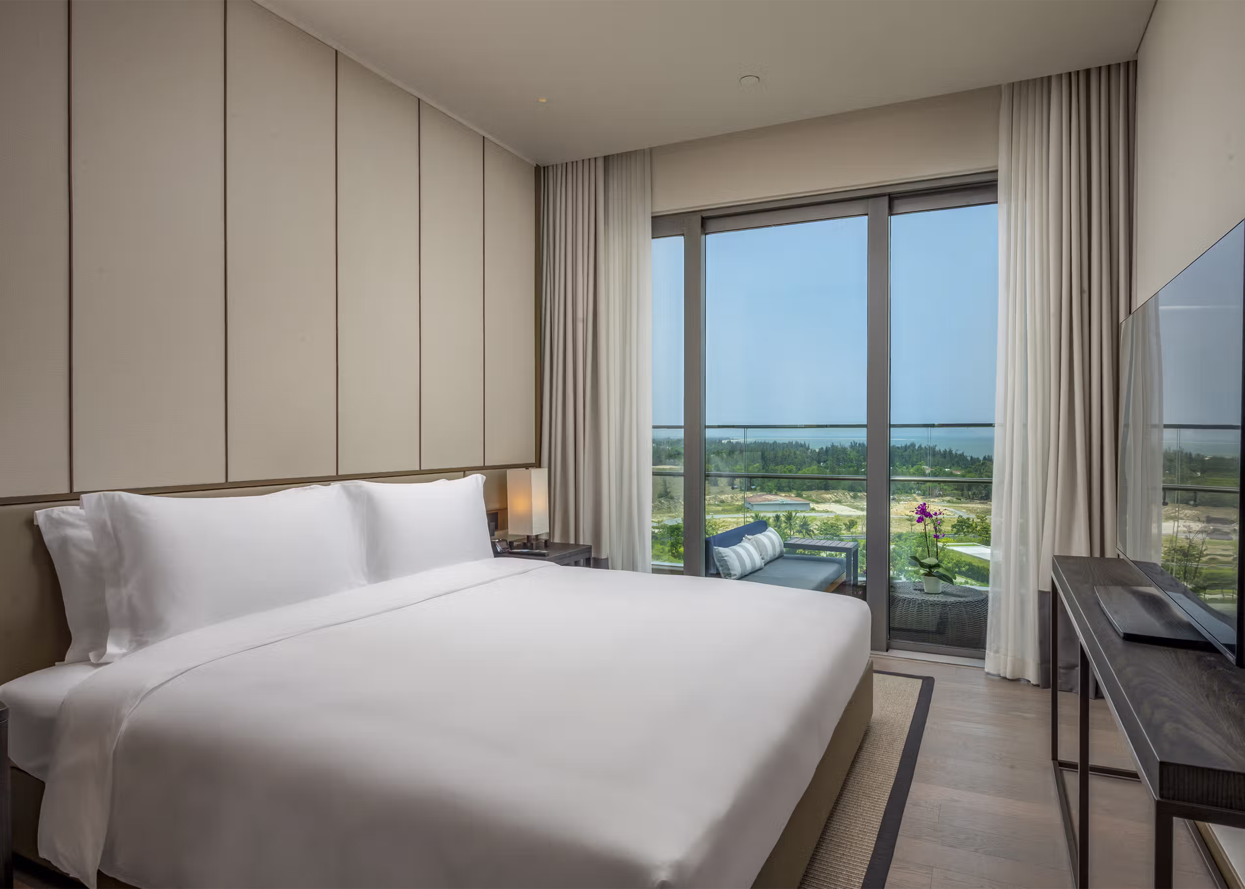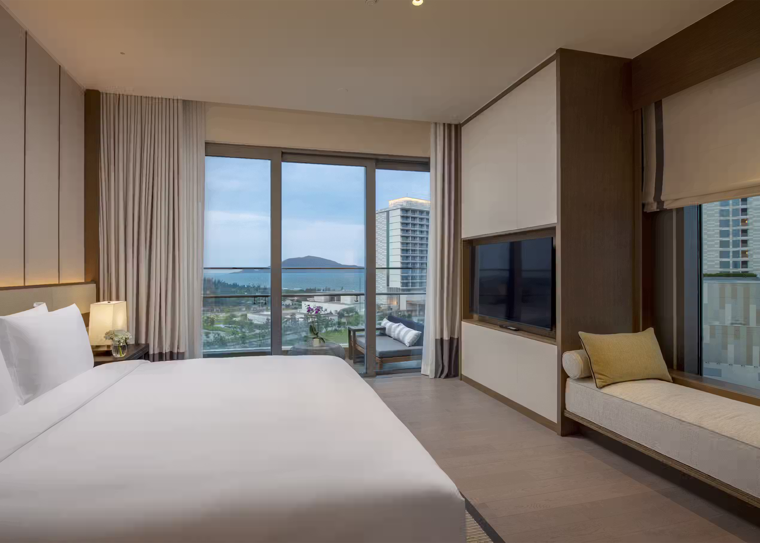 Multi-bedroom flexibility for families or groups, elevated ocean view positioning, individual bathroom luxury in each room, complete kitchen and dining setup, adaptable living spaces.